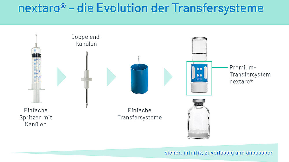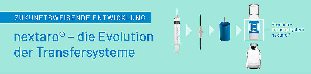 Diese beeindruckende Entwicklung bis hin zum Premium-Transfersystem nextaro® zeigt, dass die Evolution der Rekonstitutionssysteme weit fortgeschritten ist. Durchdachte Innovationen in der Transfersystem-Produktgruppe nextaro® ermöglichen die individuelle Anpassung an aktuelle und neue Anforderungen. Die Produktfamilie nextaro® wird zukünftig weiterwachsen, um mit ihren revolutionären Lösungen den Anforderungen auf dem Markt zu begegnen – Patienten und Anwender immer im Fokus.